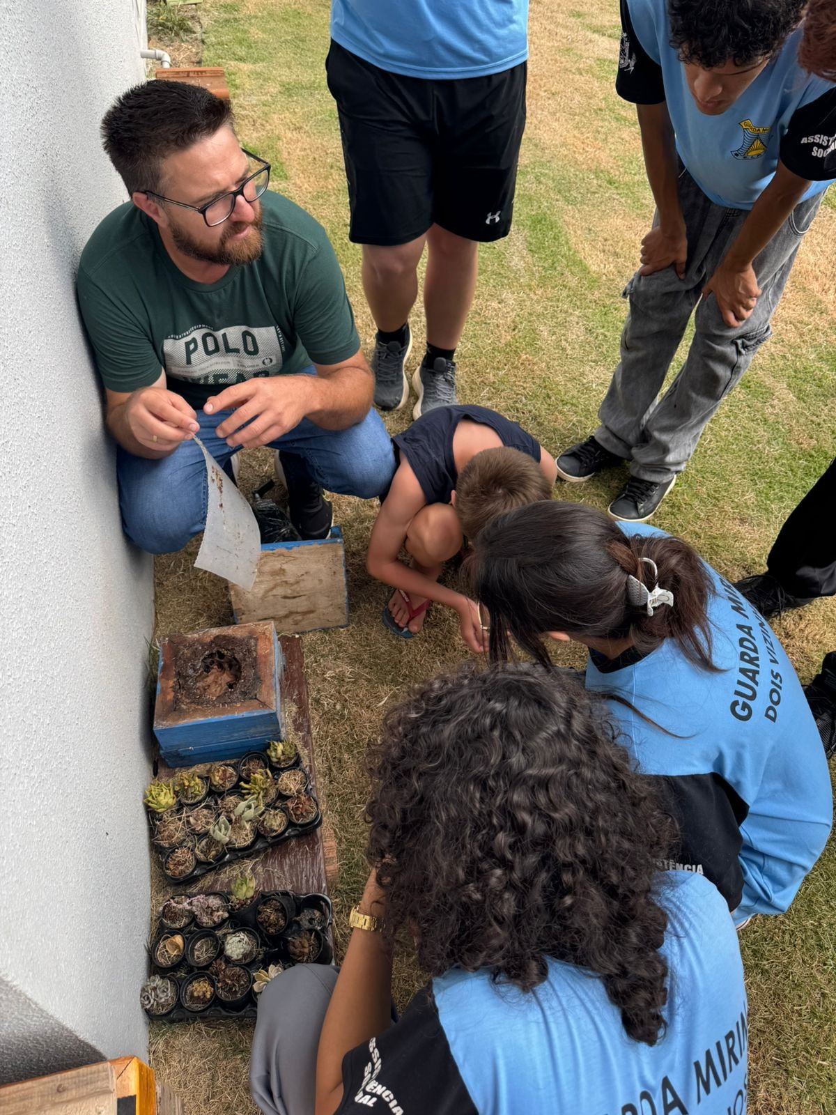 Durante a atividade, os adolescentes participaram de uma conversa sobre cidadania, ética e o impacto das atitudes individuais na sociedade e no meio ambiente. Na sequência, na casa do professor Marcelo Dotto, onde ele mantém um meliponário (criatório de abelhas sem ferrão), foi realizada uma aula prática sobre as mesmas, apresentada como uma ação ambiental simples, acessível e possível de ser desenvolvida em casa, capaz de contribuir para a preservação da biodiversidade. Os participantes puderam conhecer a importância das abelhas para a polinização, a produção de alimentos e o equilíbrio da natureza.