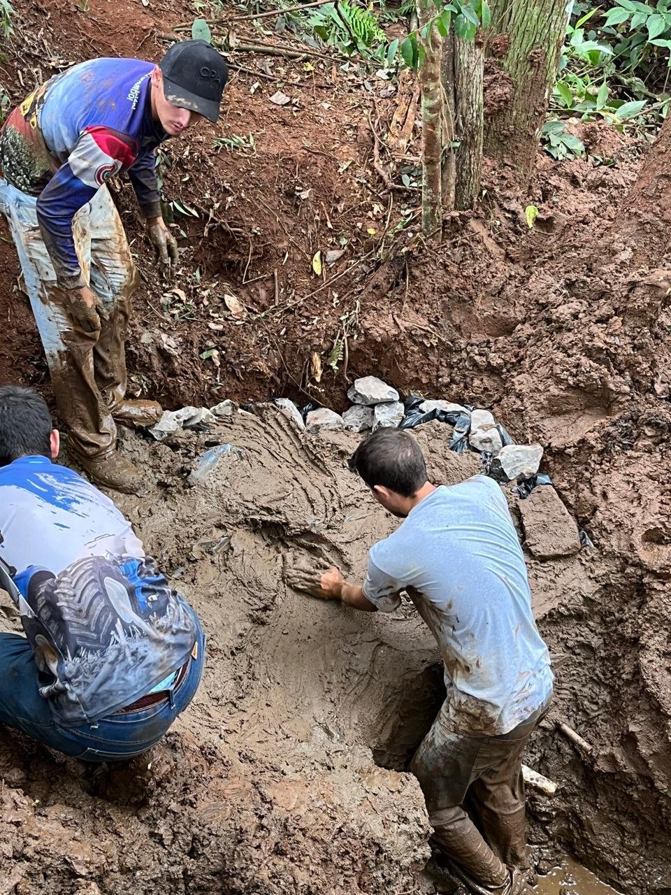 Apesar de parecer simples, o processo exige técnica e conhecimento. A proteção da nascente começa com a limpeza manual do local e a abertura de uma vala para escoar a água represada, evitando o uso de máquinas para não danificar a vegetação. Em seguida, é feita a limpeza do olho d’água, retirando terra, folhas e raízes até atingir o solo firme.