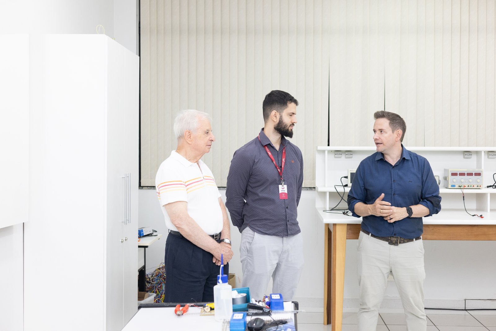O Diretor Presidente, Joseti Meimberg, o Coordenador do curso de Engenharia Elétrica, Lucas B. Zilch, e o Diretor Acadêmico, Lucas Gomes de Oliveira, apresentando os laboratórios para os calouros de engenharia Elétrica